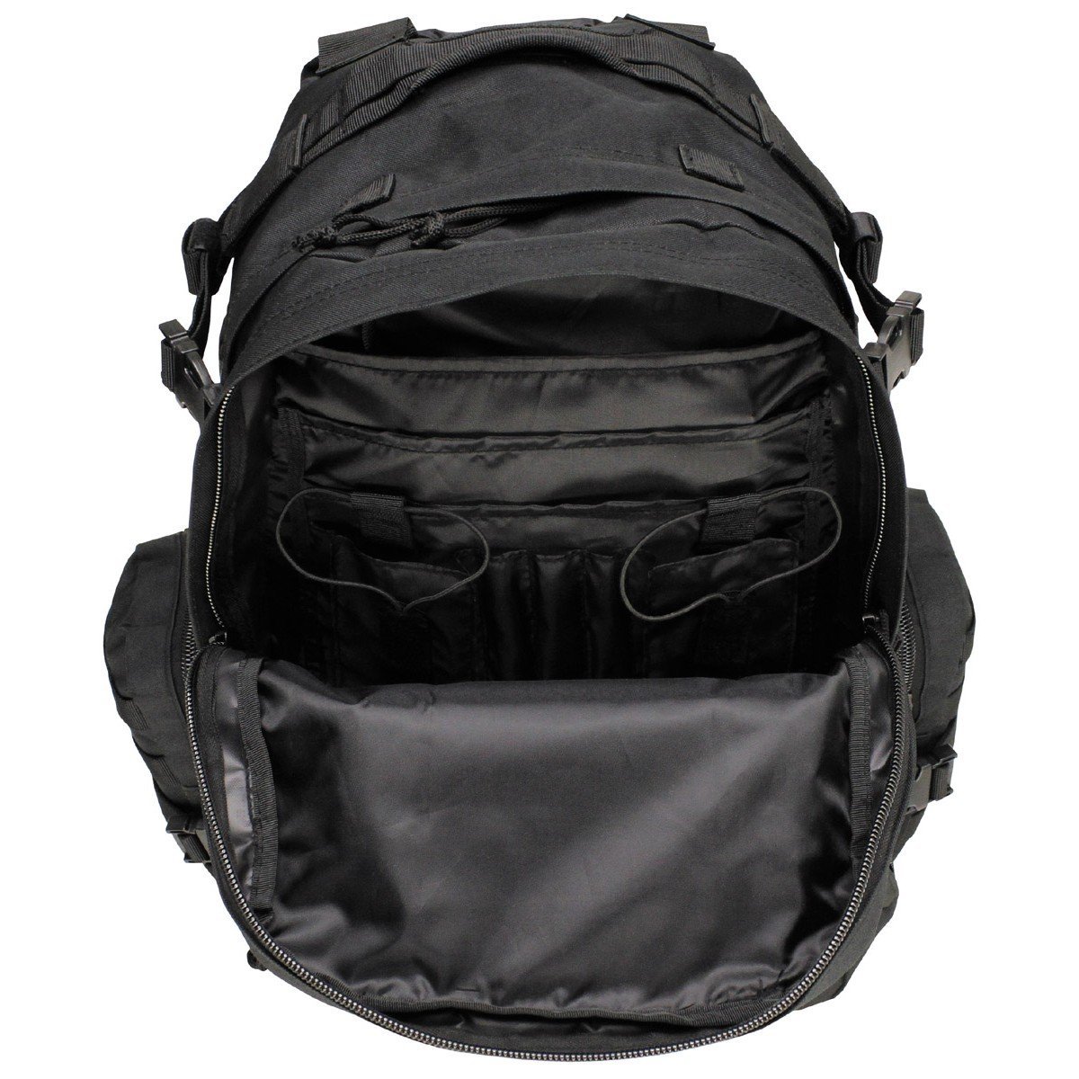 2 boční kapsy s 2cestným zipem a Molle upevňovací smyčky, zacvakávací uzávěry