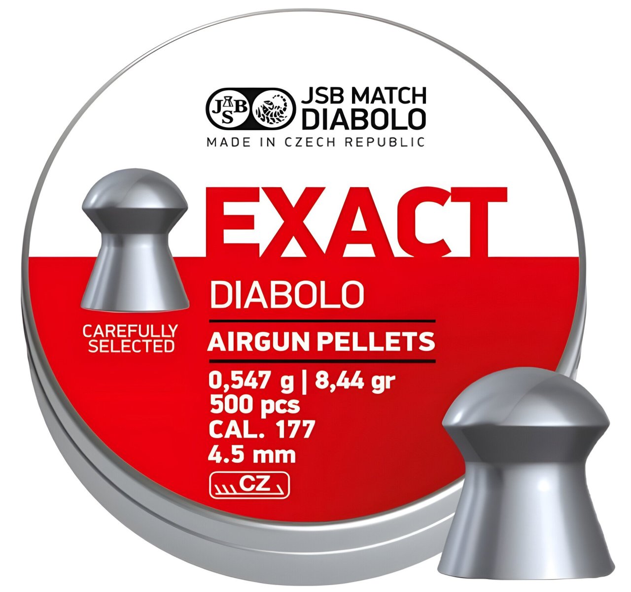 Nejkvalitnější české střelivo JSB s označením Exact, půlkulatá hlava, přesnost na velké vzdálenosti, testováno na 45 m.
