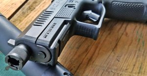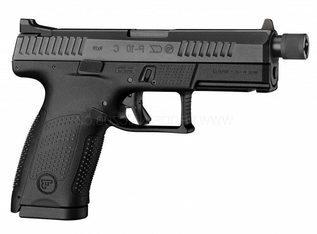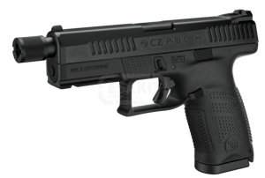 Nejpopulárnější model série CZ P-10 s prodlouženou hlavní vybavenou závitem pro montáž tlumiče hluku výstřelu.