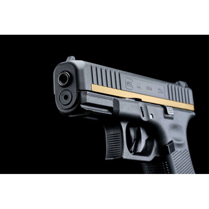 G44 FS Gold Line - model v ráži 22LR v elegantním zlatém provedení!!! Pro ty, kteří chtějí něco netradičního a mají chuť se odlišit přináší Glock právě tento model. Speciální limitovaná časově omezená edice tohoto jedinečného modelu teď září a to přímo ve zlaté barvě. Závěr má v této edici boční lišty ocelovo-polymerového závěru ve zlatém provedení, dodává to modelu doslova unikátní lesk!