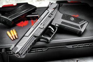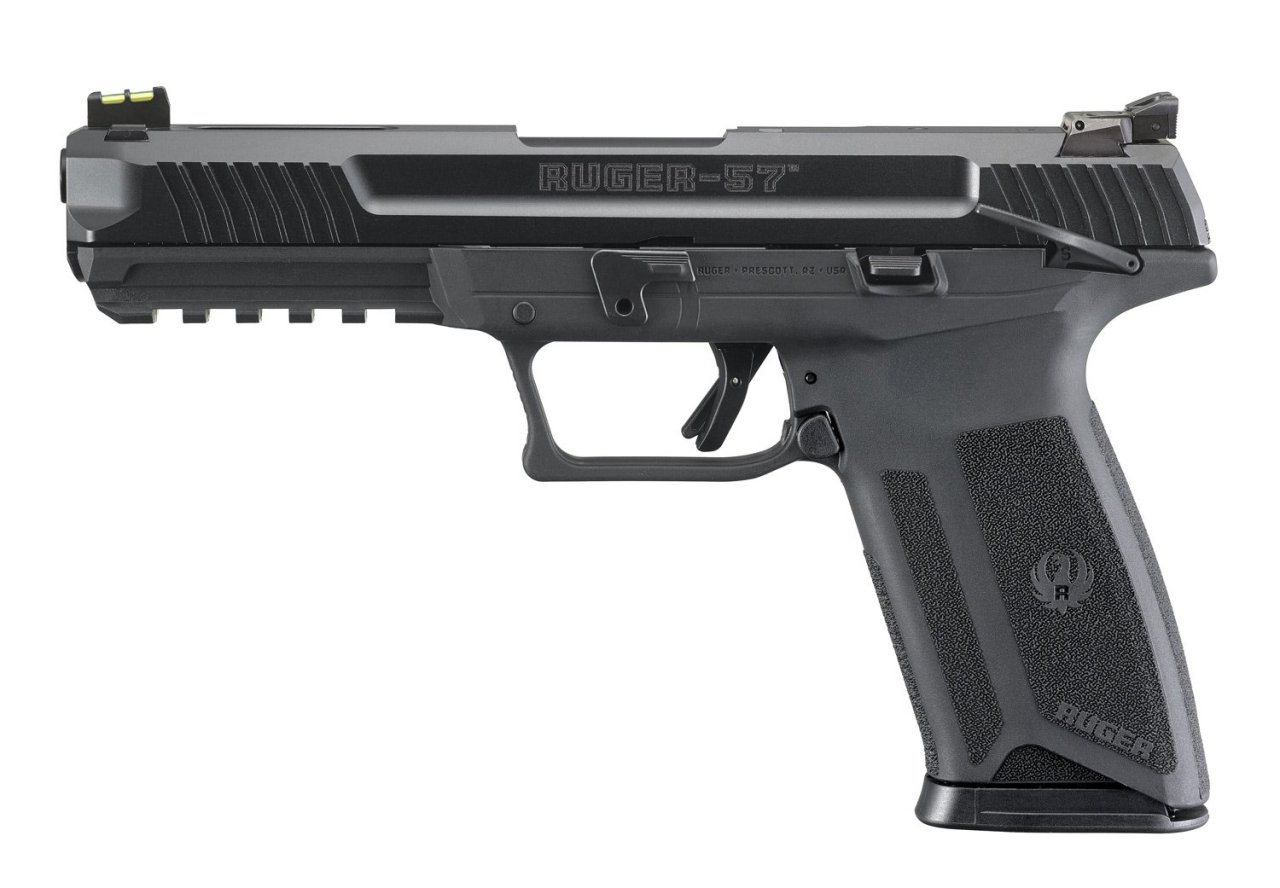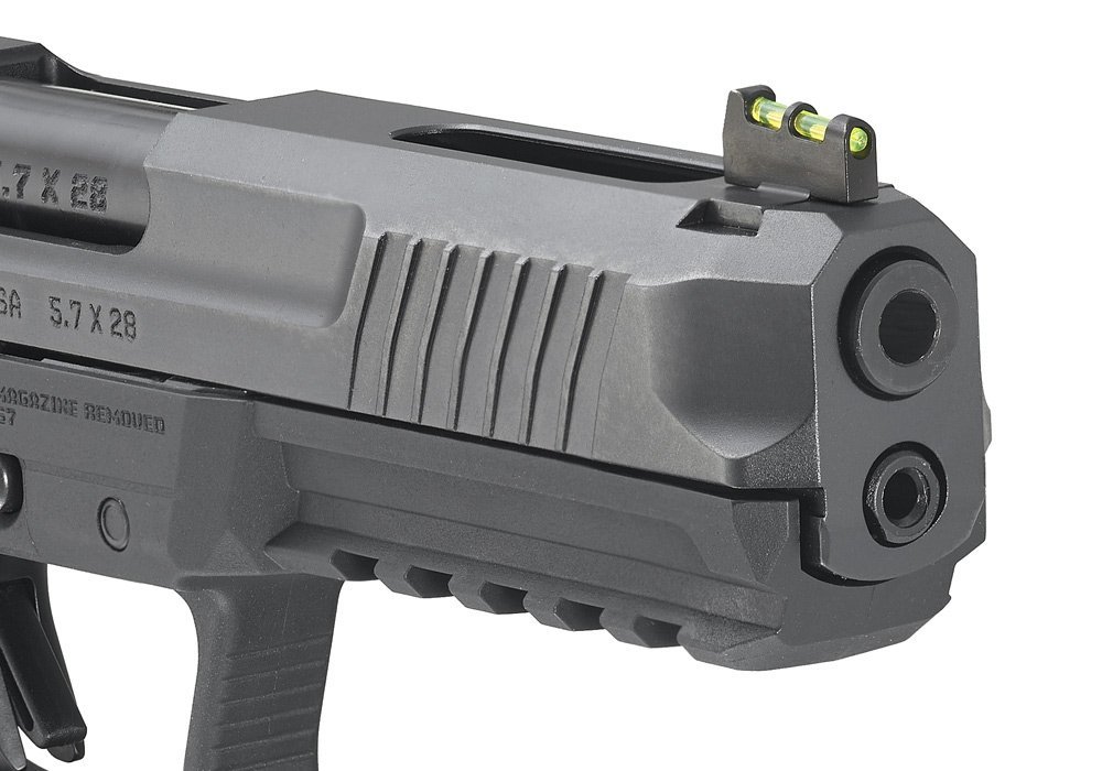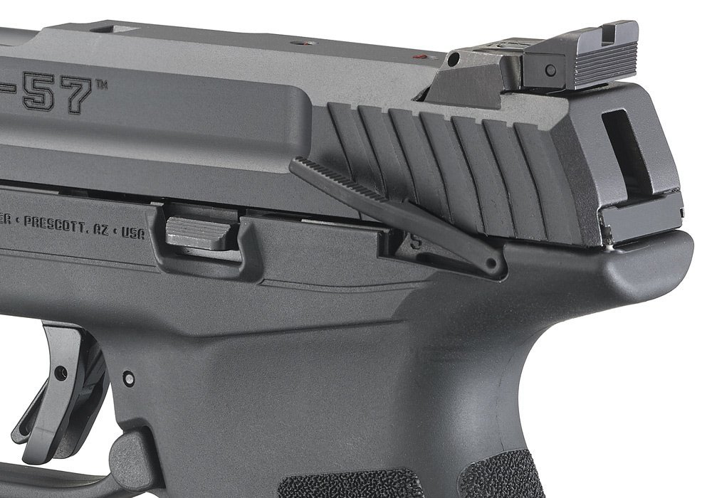 Za prvé, Ruger 57 vypadá fakt dobře. Zbraň je o něco delší než většina ostatních, ale přitom zůstává opravdu lehká, i vzhledem k obrovské kapacitě zásobníku. Díky hranatým liniím a elegantním detailům vypadá zbraň jako z nějakého sci-fi filmu. RUGER 57 odráží vše na současném stavu vývoje moderní bojové pistole.Lehký polymerový rám je výborný, agresivně podseknutý pro vysoké držení. Pistole padne do ruky opravdu skvěle..Na spodku rámu je k dispozici velkoryse dlouhá Picatinnyho lišta pro montáž příslušenství. Plochá spoušť je pohodlná a ostrá. Oboustranný tlačítkový záchyt zásobníku má tu správnou velikost. Oboustranná palcová pojistka je dlouhá, pozitivní a skvěle se ovládá.Na závěru najdete připravené otvory pro montáž adaptéru na připevnění optiky. Hledí je výškově i stranově stavitelné a disponuje světlovodivou muškou pro rychlé zamíření.