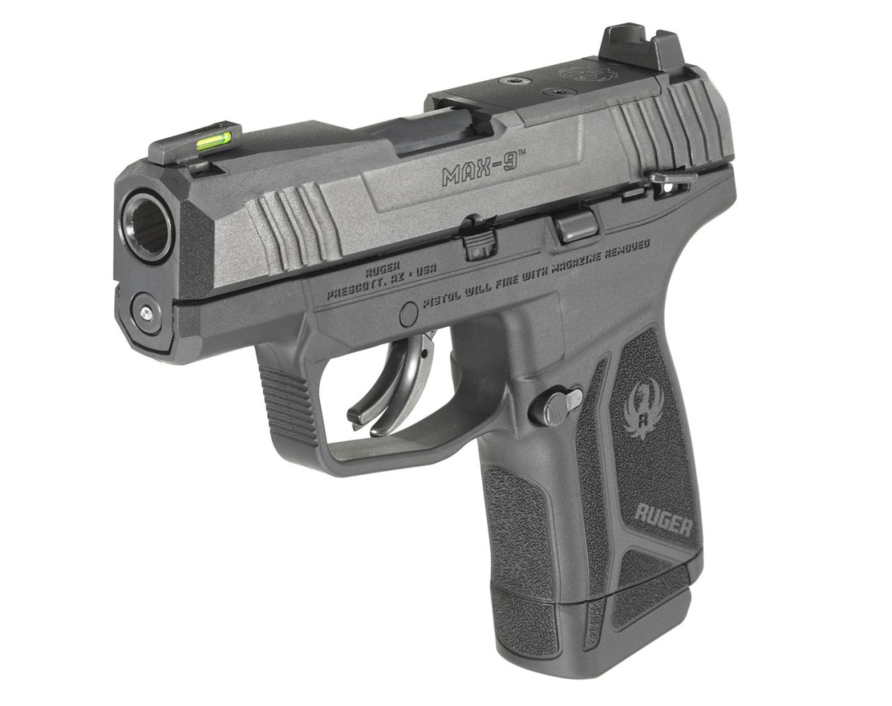Model MAX-9 má robustní konstrukci se závěrem z tvrzené legované oceli, jednodílné, přesně opracovaná šasi pro perfektní ovládání a vysoce výkonný, skelnými vlákny plněný nylonový rám rukojeti.Mířidla disponují tritiovým optickým vláknem pro dobrou viditelnost i za snížených světelných podmínek a zadní hledí s možností nastavení driftu. Systém "optics-ready" v podobě odnímatelné destičky přímo na závěru pistole umožňuje montáž optického zaměřovače.Bezpečnostní prvky zahrnují integrovanou pojistku spouště, manuální pojistku, vnitřní blokátor úderníku a kontrolní otvor, který umožňuje vizuální potvrzení nabité nebo prázdné komory.Závěr zásobníku je oboustranný. Úderník vyniká krátkým, hladkým chodem spouště, čistým přerušením a pozitivním resetem.Součástí dodávky jsou také: dva zásobníky s teflonovou povrchovou úpravou E-Nickel a podlahová deska pro prodloužení rukojeti pro prsty, kterou lze přidat k zásobníku pro pohodlnější a lepší úchop.Pistole RUGER MAX-9 v bodech:- kompaktní zbraň vhodná pro skryté nošení- odolný polymerový rám a závěr s oceli- systém "optics-ready" pro montáž optického zaměřovače- tritiová muška se světlovodným vláknem, stavitelné hledí- manuální pojistka- kapacita zásobníku: 12 nábojů- ráže: 9 mm Luger