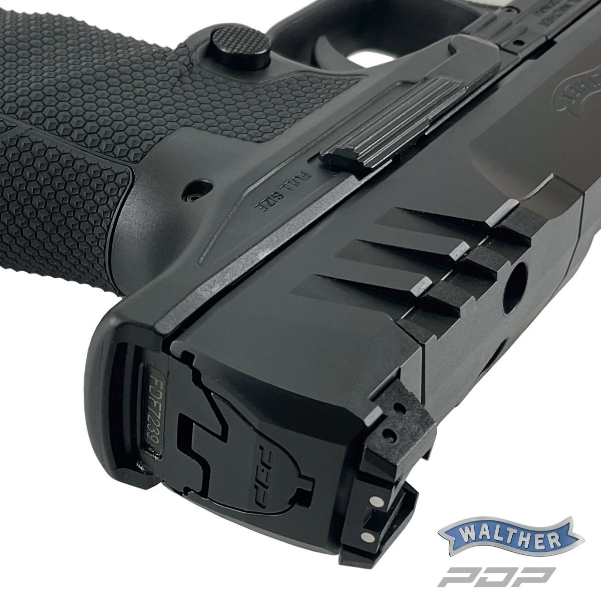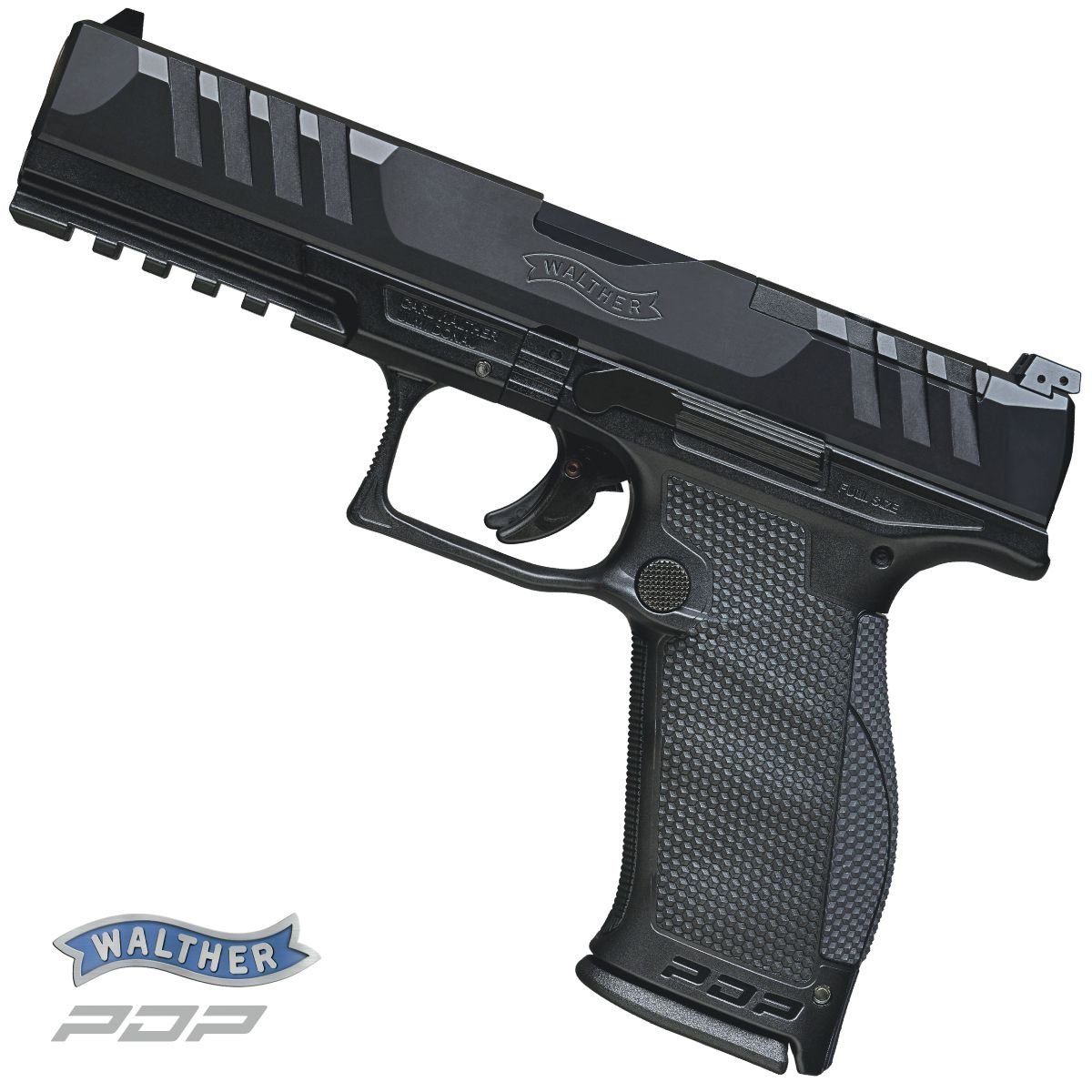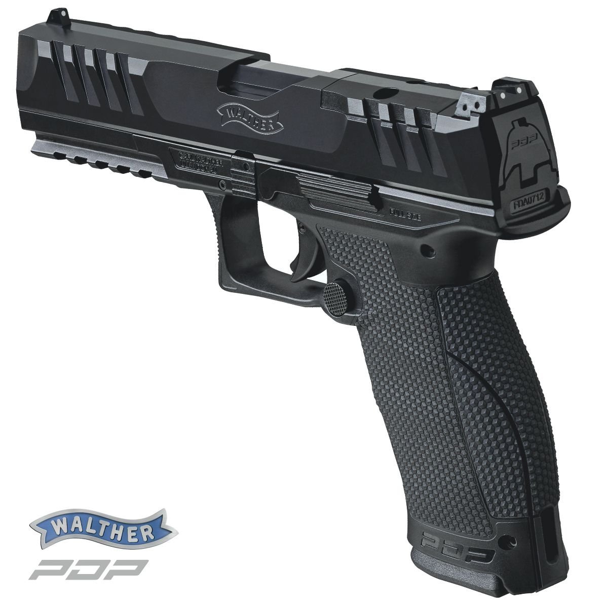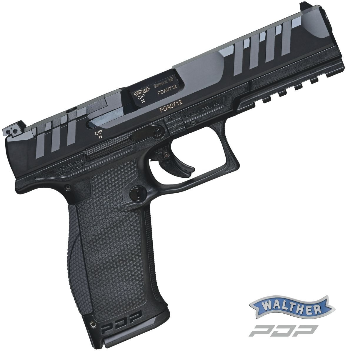 Novinka pro rok 2021 v portfoliu Carl Walther GmbH. PDP = Performance Duty Pistol je univerzální zbraň vhodná pro služební, obranné, tak i sportovní použití. Řada PDP se vyrábí ve dvou verzích velikosti rámů. Full Size (délka hlavně 4", 4,5", 5") a Compact (4" a 5") prozatím pouze v ráži 9 mm Luger. Hlavní rozdíl je v délce rukojeti. Zatímco PDP Full Size pojme zásobník na 18 nábojů a má delší rukojeť, takže bude vyhovovat střelcům s větší rukou, modely PDP Compact délkou prakticky kopírují kratší rukojeť pistolí Walther PPQ a pojmou zásobník na 15 nábojů. Základní technické data Walther PDP Compact 5" jsou 143 mm výška, 34 mm šířka a celková délka zbraně je 210 mm. Nejvýraznějsím prvkem masivního závěrou jsou zvětšné hmatníky tzv. SuperTerrain pro kvalitnější ovládání. Ty značně usnadňují manipulaci s i bez rukavic ve všech povětrnostních podmínkách. Všechny pistole PDP jsou tzv. Optics Ready = jsou připraveny pro instalaci pistolových kolimátorů. Krycí deska základny kolimátoru přesně kopíruje profil závěru a po jejím odšroubování lze pomocí příslušných adaptérů instalovat pistolové kolimátory prakticky všech předních výrobců. adaptér PDP 01 (2859211): Docter, Noblex, Meopta adaptér PDP 02 (2859220): Trijicon, Holosun, Riton, Axion adaptér PDP 04 (2859238): Leupold DeltaPoint, Shield, Sig Romeo Zero adaptér PDP 06 (2859246): Vortex Viper Nadstandardní mířidla jsou kombinací nízkého stavitelného hledí v obou osách a mušky hranolovitéhoho tvaru. Pro rychlejší zamíření cíle jsou mířidla vybaveny bílými tečkami. Hlaveň délky 5" / 127 mm s polygonálním vývrtem má stoupání 1/10" a odstupňovanou komoru (tzv. Lugerův odskok) zajišťující konzistentní počáteční rychlosti střely a vysokou funkční spolehlivost. Vylepšená nová spoušť Performance Duty Trigger se vyznačuje velmi jemným a hladkým chodem při odporu 25 N a krátkým resetem 7 mm / 11 N. Tato spoušt je mimochodem hodnocena jako nejlepší ve své kategorii = "Best in Class" O kvalitní úchop zbraně se stará egonomická rukojeť s povrchovou texturou z jehlanů. Jedná se o ideální kompromis pro kvalitní úchop s/bez rukavic i za zhoršených podmínek = zpocená, zmrzlá ruka. Tři skloněné velké drážky na prsty v přední části rukojeti mají za úkol zvýšit univerzálnost úchopu zbraně pro každou ruku. Střelec si může rukojeť doladit ještě pomocí tří výměnných hřbetů rukojeti. Modularitu zbraně zvyšuje též montážní lišta Picatinny pro instalaci doplňkových zařízení a tlačítkový vypouštěč zásobník s volitelnou orientací.