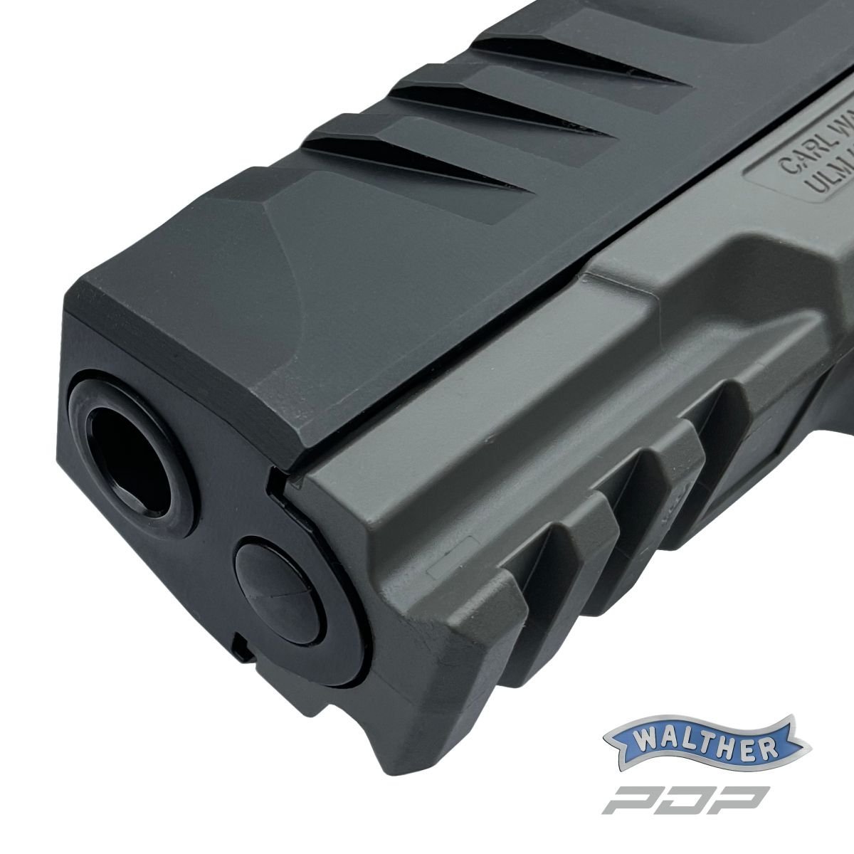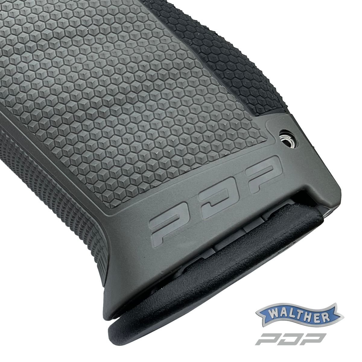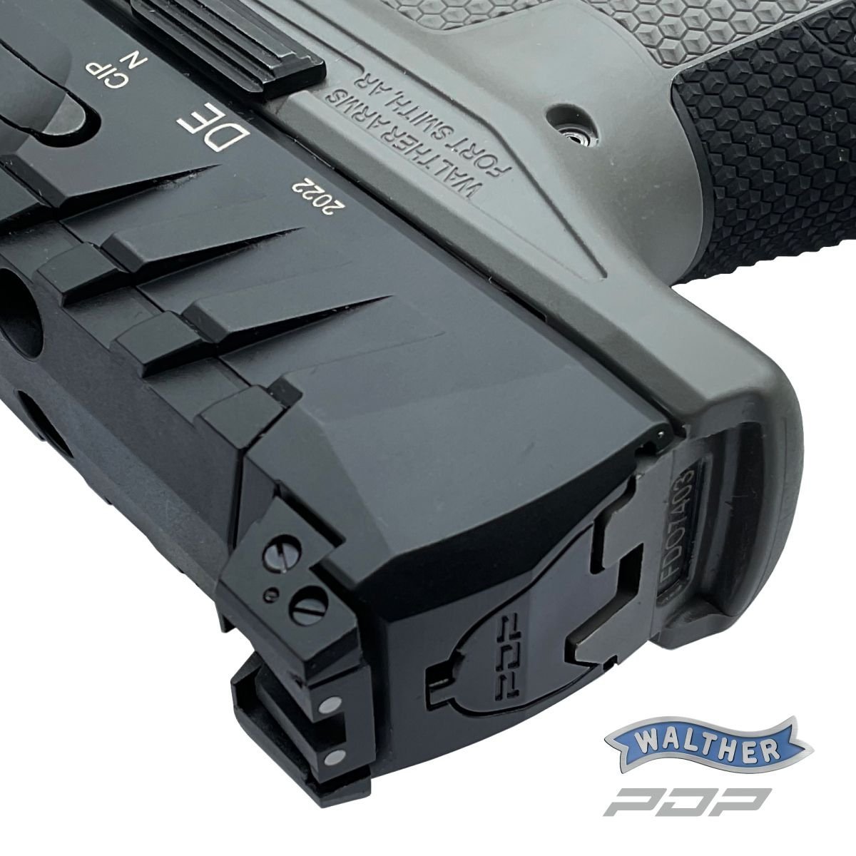 Novinka pro rok 2022 s barevným rámem v barvě FDE. PDP = Performance Duty Pistol je univerzální zbraň vhodná pro služební, obranné, tak i sportovní použití. Řada PDP se vyrábí ve dvou verzích velikosti rámů. Full Size (délka hlavně 4", 4,5", 5") a Compact (4" a 5") prozatím pouze v ráži 9 mm Luger. Hlavní rozdíl je v délce rukojeti. Zatímco PDP Full Size pojme zásobník na 18 nábojů a má delší rukojeť, takže bude vyhovovat střelcům s větší rukou, modely PDP Compact délkou prakticky kopírují kratší rukojeť pistolí Walther PPQ a pojmou zásobník na 15 nábojů. Základní technické data Walther PDP Compact 5" jsou 135 mm výška, 34 mm šířka a celková délka zbraně je 184 mm. Nejvýraznějsím prvkem masivního závěrou jsou zvětšné hmatníky tzv. SuperTerrain pro kvalitnější ovládání. Ty značně usnadňují manipulaci s i bez rukavic ve všech povětrnostních podmínkách. Všechny pistole PDP jsou tzv. Optics Ready = jsou připraveny pro instalaci pistolových kolimátorů. Krycí deska základny kolimátoru přesně kopíruje profil závěru a po jejím odšroubování lze pomocí příslušných adaptérů instalovat pistolové kolimátory prakticky všech předních výrobců.