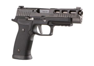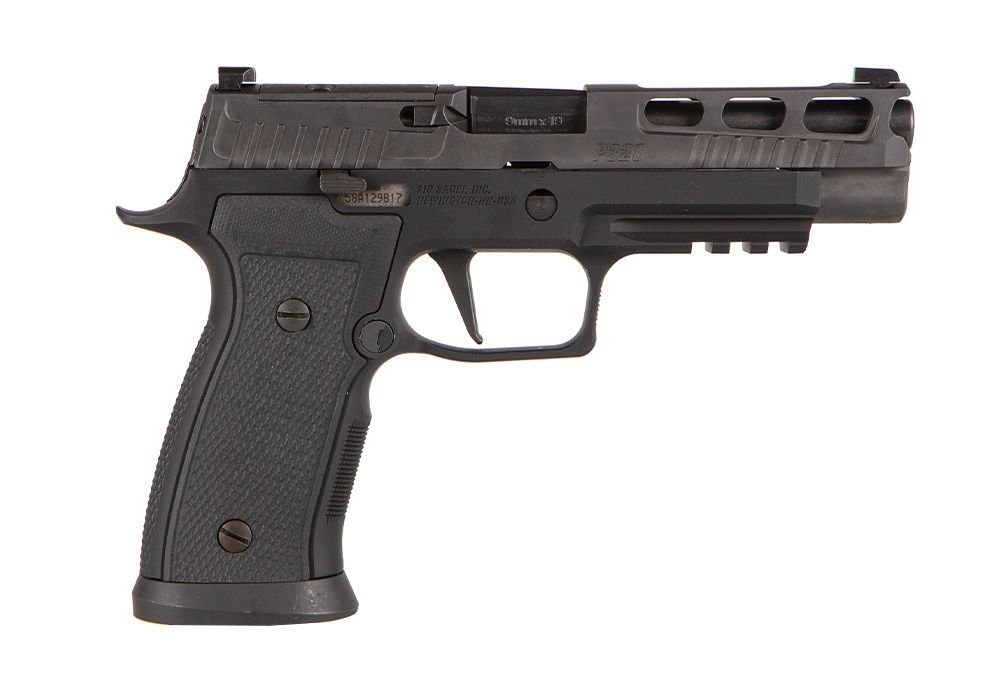 Design Pro-Cut závěru s povrchovou úpravou Nitron je perfektně sladěný s černě eloxovaným AGX tělem zbraně. Moderní prvky a modularita řady P320 v kombinaci s výkonem a vlastnostmi kovového rámu poskytují vskutku speciální zážitek. Černě eloxovaný AXG rám je doplněn G10 střenkami od Hogue a odnímatelnou Magwell pro snadnější přebíjení. Plochá spoušť XSeries zajišťuje čisté spuštění mechanizmu v 90° a napomáhá větší přesnosti a přesnějšímu trigger resetu. Optics ready Pro-cut závěr je osazen tritiovými mířidly XRax3 a je kompatibilní s kolimátory Romeo1PRO, Romeo2 a Deltapoint PRO (uchycení přímo na závěr, bez montážních destiček). Zbraň je dodávána se dvěma 17-ti rannými zásobníky s duralovými botkami Hennig Group. Běžné zásobníky pro P320 nejsou kompatibilní s Magvell na tomto modelu, ta musí být pro použití s běžnými zásobníky sundána