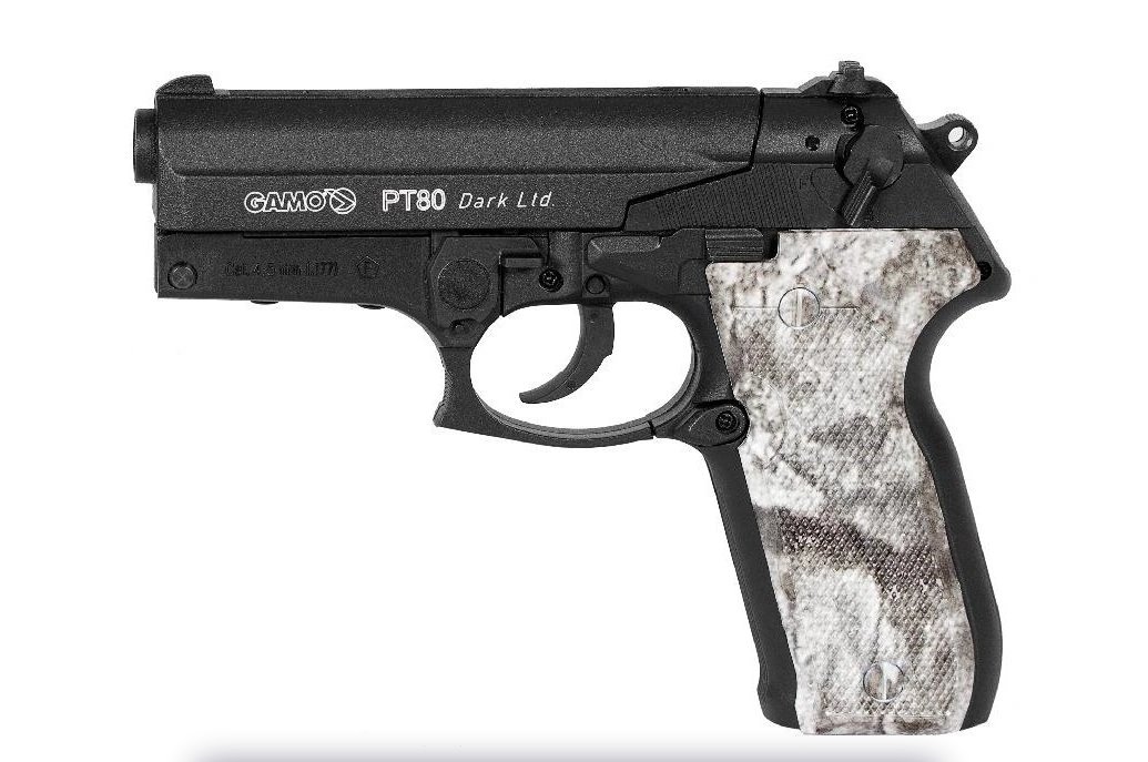 Limitovaná edice pistole Gamo PT-80 ráže 4,5 mm s polymerovými camo střenkami. Tato pistole je ideální na plinking. Má lehkou, ale odolnou konstrukci z polymeru. Rám je pevně spojený s odklopným závěrem, který ukrývá prostor pro věnečkový zásobník. Pistoli pohání klasická 12g bombička CO2, která se vkládá do rukojeti. Jako střelivo slouží klasické olověné diabolky. Speciální věnečkový zásobník pojme celkem 8 diabolek. Výrobce byl velkorysý a v balení naleznete rovnou tři věnečkové zásobníky. Manuální pojistka pro zajištění zbraně se nachází na levé straně závěru. Spoušťový mechanismus SA/DA.