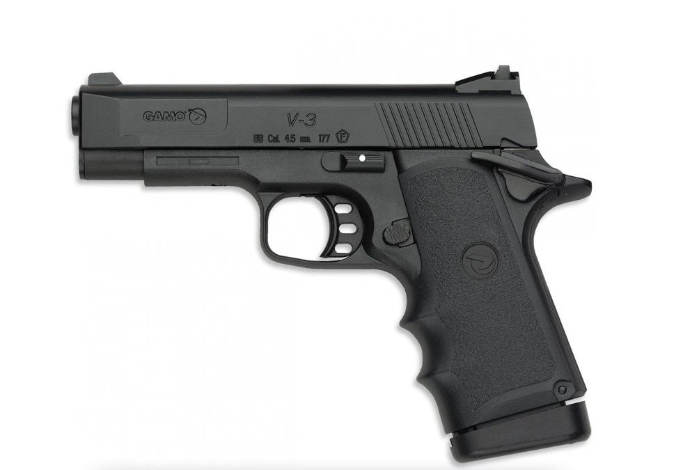 Celočerněná plastová poloautomatická vzduchová pistole Gamo V-3 v kalibru 4,5mm. Malá a kompaktní vzduchová pistole poháněná CO2 bombičkami.